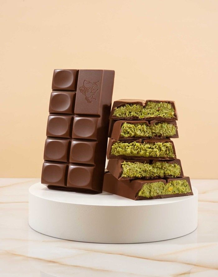 Más que un postre, es una experiencia visual. En una ciudad donde el diseño lo atraviesa todo, el chocolate se transforma en objeto de deseo: barras rellenas con pistache o kunafa crujiente, bombones geométricos con acabados metálicos y piezas cubiertas con láminas de oro comestible. Cada creación parece pensada para ser fotografiada antes de probarse.